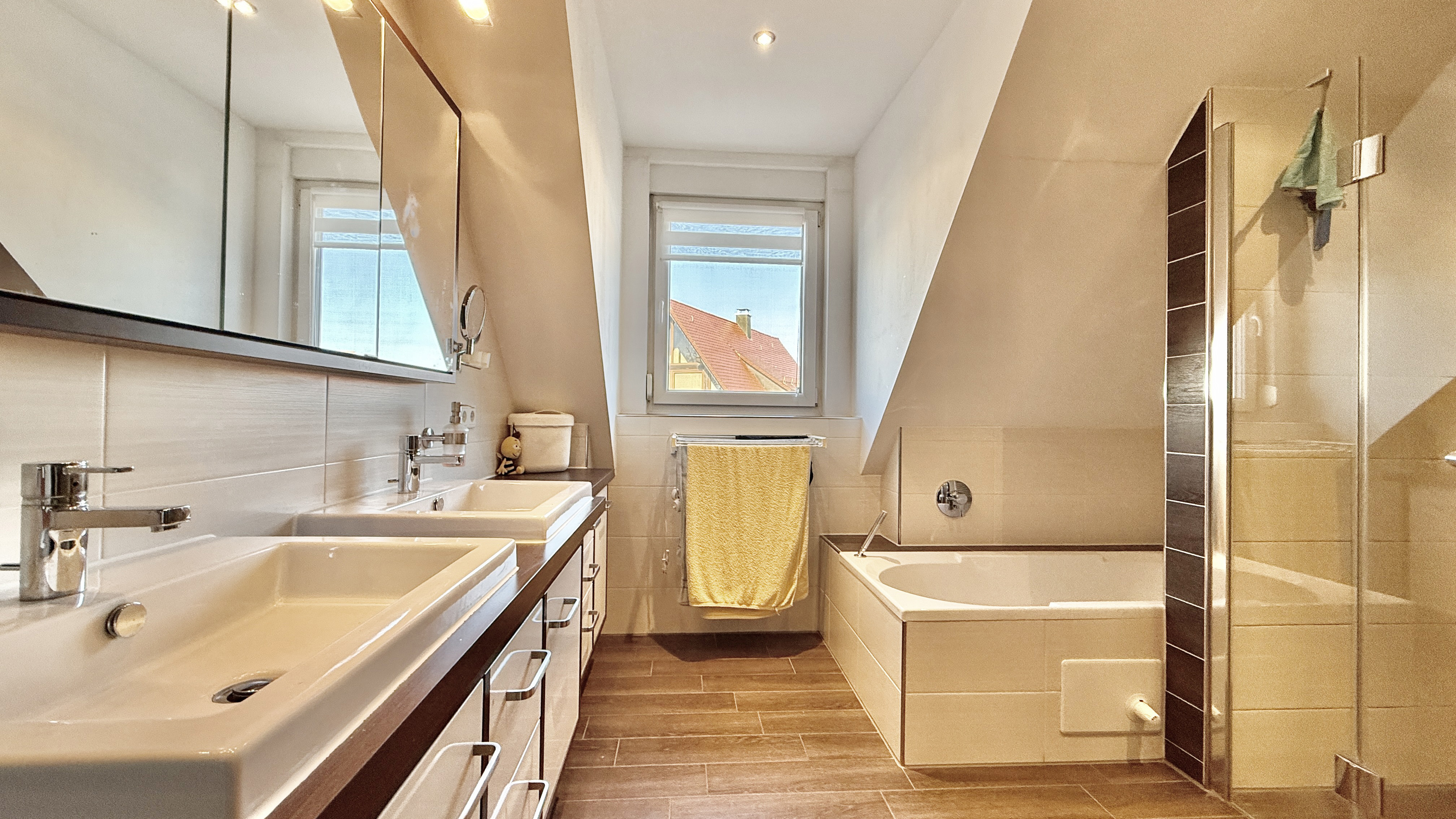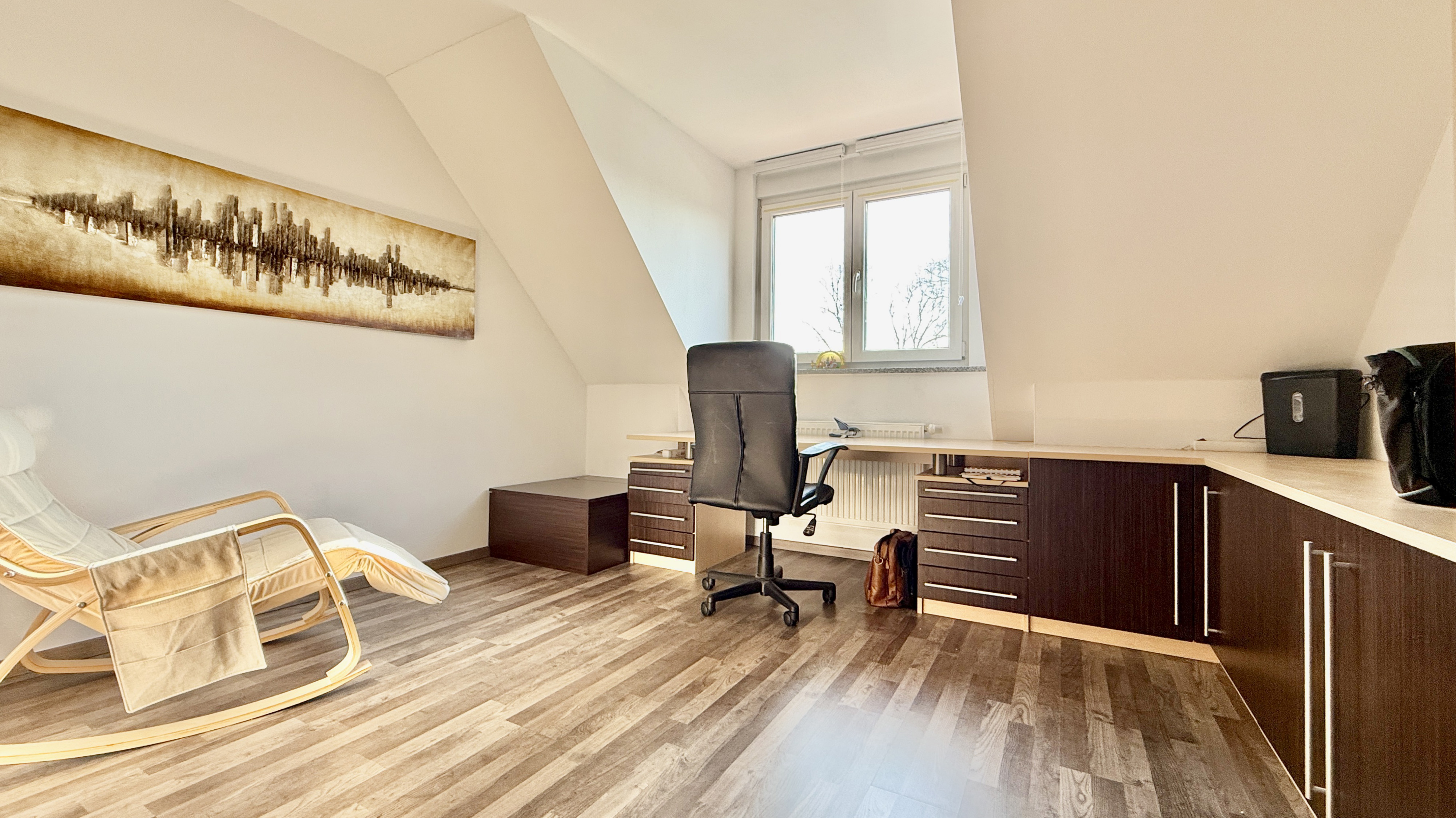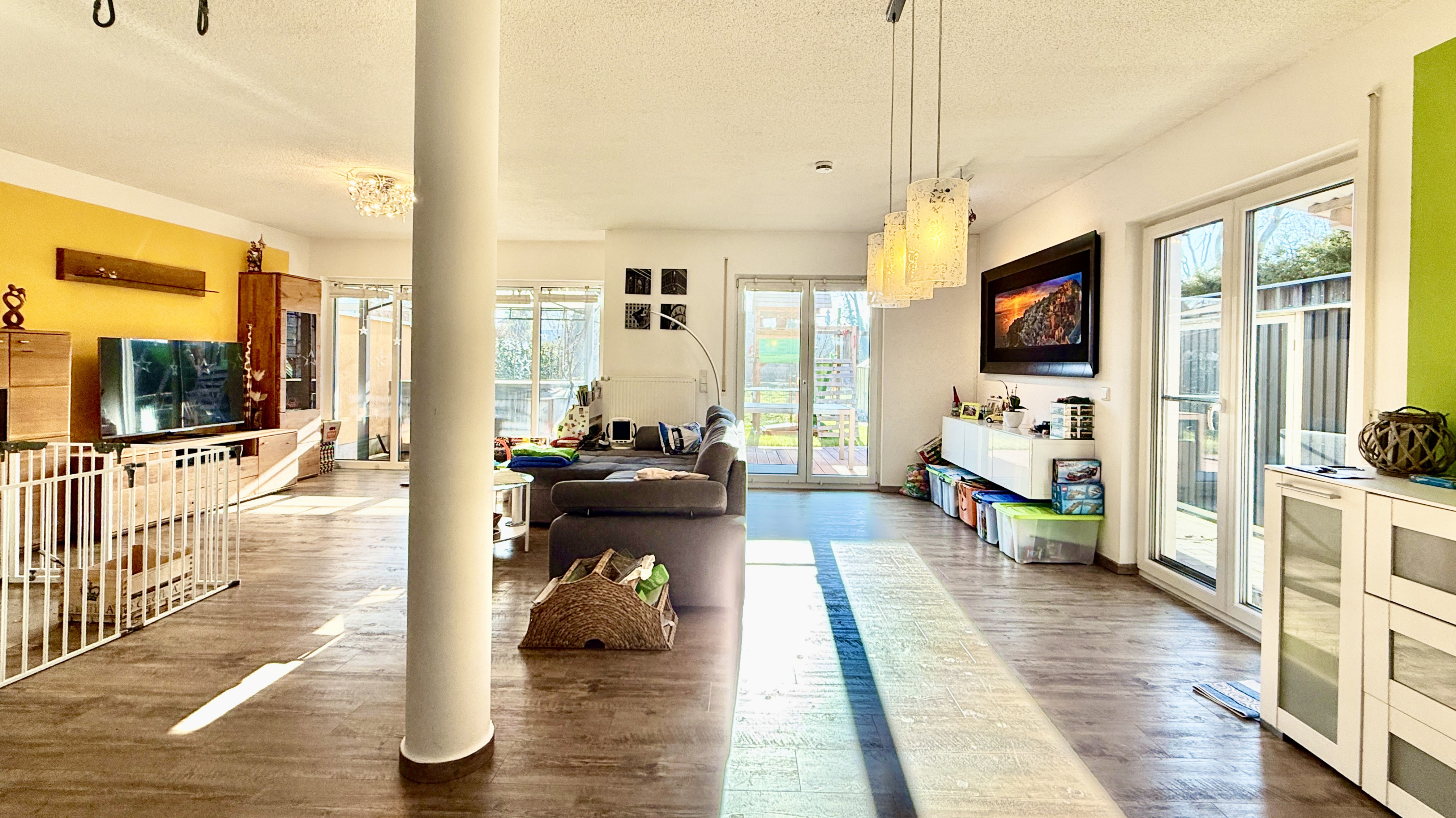 Diese sehr schöne im Jahre 2011 in Massivbauweise erstellte und modern ausgestattete Doppelhaushälfte, bietet eine optimale Aufteilung für eine Familie. Die geradlinige Architektur erzeugt in Kombination mit den idealen Lichtverhältnissen (Südwest-Ausrichtung) eine angenehme und harmonische Wohnatmosphäre. Im Erdgeschoss gelangen Sie über den Flur mit separatem WC und praktischen Abstellraum in den offenen Wohn-/ Essbereich mit moderner Einbauküche verteilt auf einer Wohnfläche von ca. 55m². Die hochwertige Küche ( gegen Ablöse) mit angefertigten Einbauten lässt keinen Komfort vermissen. Darüber hinaus erwarten Sie bodentiefe Fenster, ein hochwertiger Vinyl-Bodenbelag und reichlich Raum für gemütliche Sitzgelegenheiten mit Blick in den Garten. Über zwei Terrassentüren erreichen Sie den gärtnerisch wunderschön bepflanzten Garten, welcher nach Süden ausgerichtet ist. Die sonnige Garten-Terrasse lädt Sie an lauen Abenden ein, auf einer gemütlichen Gartenbank, den Ausblick auf die Wiesen und in die Weite der Natur zu genießen. Über die Holztreppe erreichen Sie das Obergeschoss. Hier befinden sich drei Räume, die Sie zum Schlafen, Arbeiten oder für Kinder und Gäste auf vielfältige Art und Weise nutzen können. Das Schlafzimmer und das zweite Kinderzimmer sind mit bodentiefen Fenstern versehen. Eine Tatsache die den Räumen eine helle, freundliche Atmosphäre verleiht. Das Bad ist modern und mit sehr schönen Armaturen ausgestattet. Sie finden eine Badewanne zum Entspannen, sowie eine großzügige Dusche mit Sitzgelegenheit und ein Doppel-Waschbecken vor. Unter dem Dach befindet sich zudem ein geräumiger und voll ausgebauter Spitzboden, der im Moment als weiteres Kinderzimmer genutzt wird. Auch für Zwecke der Kombination von Wohnen und Arbeiten ist das Haus bestens geeignet. Die hellen und großen Räume im Untergeschoss, lassen sich zusätzlich prima als Arbeits-/Gästezimmer einrichten. Der Carport mit einem angebauten Abstellraum sowie die zwei zusätzlichen Stellplätze vor dem Haus runden dieses interessante Angebot auf perfekte Art und Weise ab.